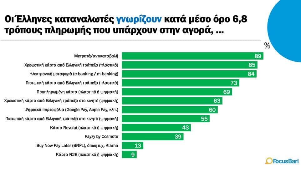 • Οι Έλληνες καταναλωτές γνωρίζουν σχεδόν τους μισούς τρόπους πληρωμής ενώ χρησιμοποιούν το 1/3 από αυτούς που είναι διαθέσιμοι.