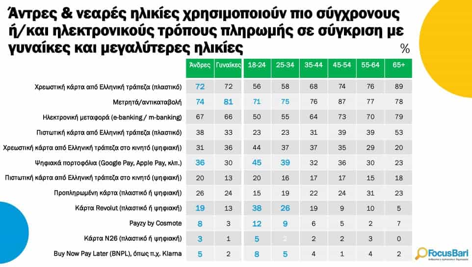 • Αντρες και οι μικρότερες ηλικίες είναι πιο εξοικειωμένοι με τους πιο σύγχρονους τρόπους πληρωμής.